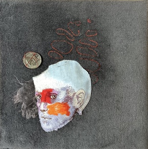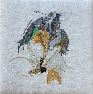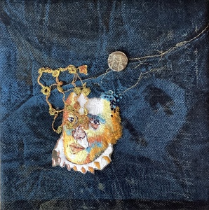 2022Het verbeeld voor mij de overwinning op het vrije denken met respect voor al wat leeft, weg uit de beperkingen. canvas, monoprint, applicatie, handborduur, munt.