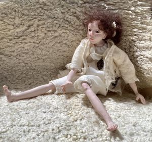 2018Bewegend beeld, klei met textiel, vilten jasje.