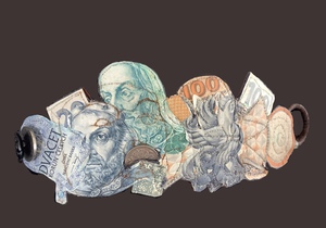 Vervaardigd uit 3 bankbiljetten, collage gestikt op suède met 2 munten.