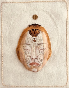2022Het verbeeld voor mij de overwinning op het vrije denken met respect voor al wat leeft, weg uit de beperkingen. canvas, monoprint, applicatie, handborduur, munt.